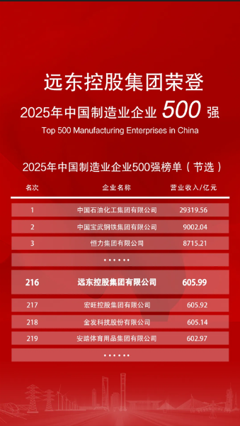 2025年9月20日,2025世界制造業大會在合肥盛大開幕。中國企業聯合會、中國企業家協會在大會開幕式上重磅發布“2025中國制造業企業500強”榜單,遠東控股集團憑借強勁的綜合實力位列榜單第216位,相較去年躍升13位,展現出企業在制造業領域持續進階的硬核實力。
