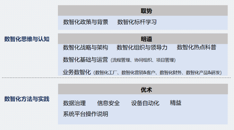 數智化取勢項目:了解國家及行業發展態勢,通過學習標桿制造業數智化轉型案例,與優秀企業對話,全面對標,全面超越。數智化明道項目:通過對遠東數智化轉型戰略的宣貫與實踐步驟的分解,對數智化轉型總體架構達成共識,通過課程培訓給予啟發,加速公司數智化轉型。數智化優術項目:將垂直行業知識與數智化技術培養相結合,為企業數智化轉型輸送復合型人才。